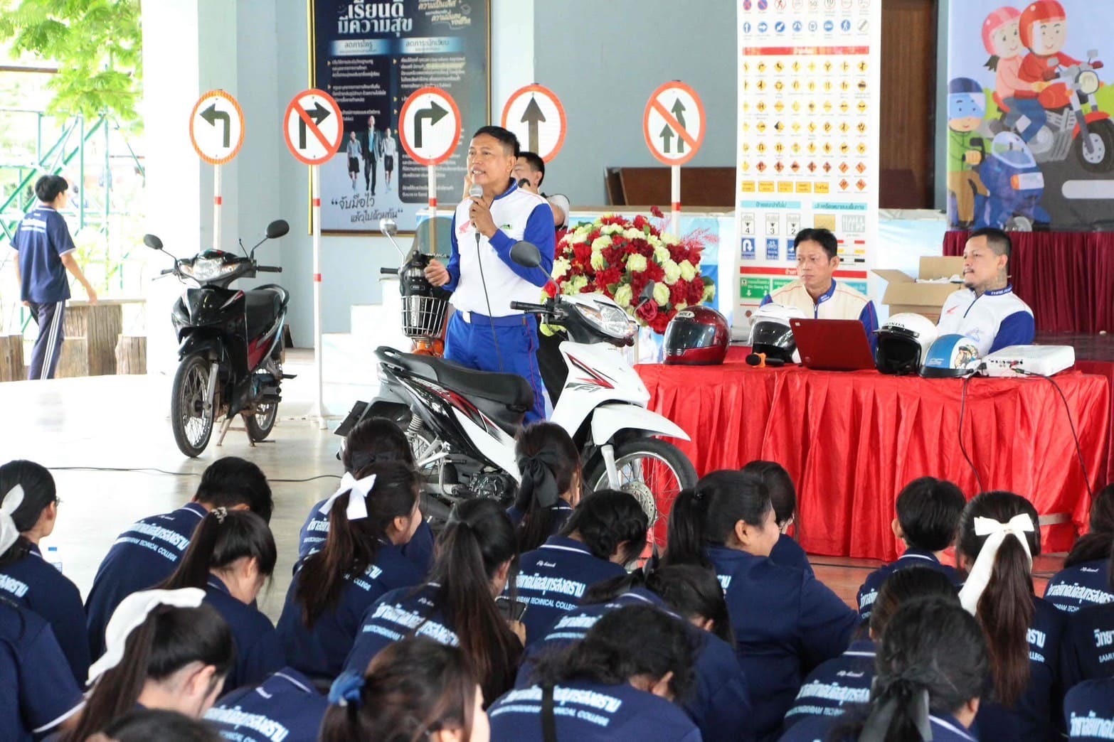 บุคลากรทางการศึกษา นักเรียน นักศึกษา ณ อาคารกิจกรรม วิทยาลัยเทคนิคสมุทรสงคราม โดยทีมวิทยากร บริษัท ฮอนด้าแม่กลอง จำกัด